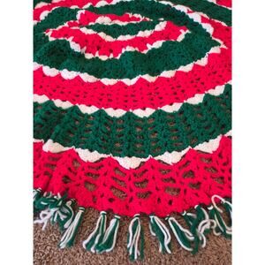 vintage hand crochet red green white holiday tree skirt tassel christmas grandma