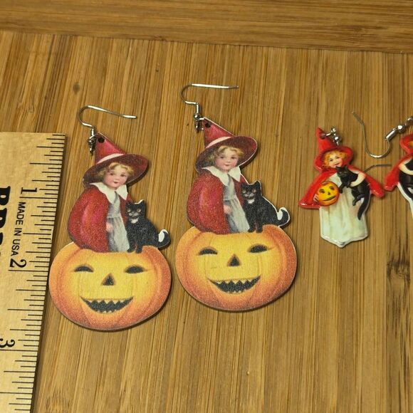 vintage inspired wooden Halloween child witch and cat earrings #HalloweenJewellery ##spookyfamily #Gothic