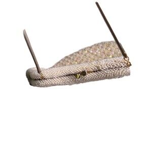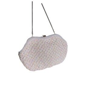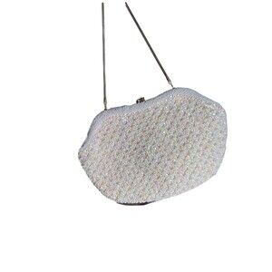 vintage la regale beaded purse White Beads Yellow Satin Lining Chain Handmade HK