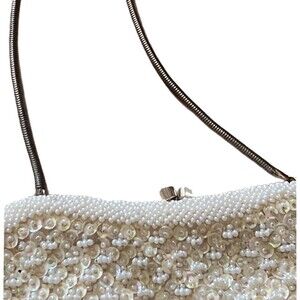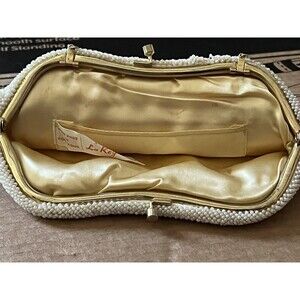 vintage la regale beaded purse White Beads Yellow Satin Lining Gold Chain.