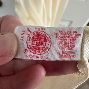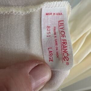 beautiful vintage lily of france for lord & taylor nightgown in soft cream. features an intricate lace bodice with floral embroidery, satin tie neckline, and flowing nylon skirt that drapes elegantly. made in the usa with an ILGWU union tag, a hallmark of authentic vintage craftsmanship.