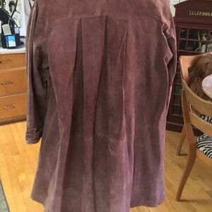 Vintage leather/suede coat. (faux?). open (no buttons) .polyester lining. 39" long. flared bottom. It states large but also fits medium. Very chick looking with jeans or leggings.