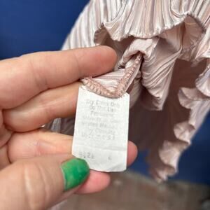 adorable, yet sexy / perfect for weddings, date night, and other special occasions / light, creamy blush accented by metallic muted floral blue and pink print / back zip closure / non-adjustable straps / excellent vintage condition