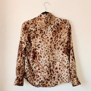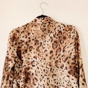 vintage leopard ruffle blouse. long sleeve, button up and ruffle detail on front. tan black and brown color leopard pattern.