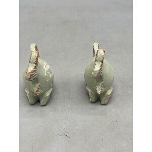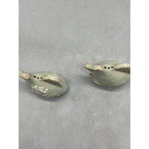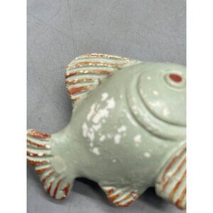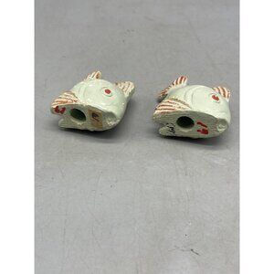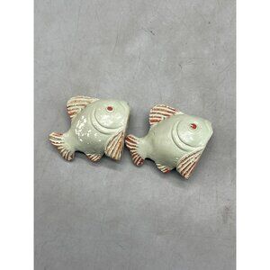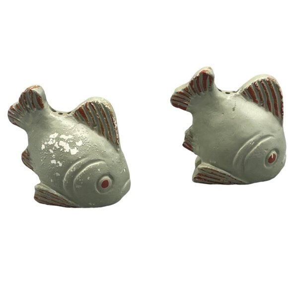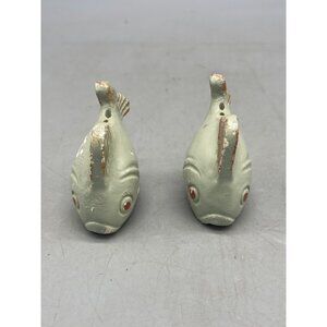 These vintage hand-painted green fish salt and pepper shakers, despite their worn condition with peeling paint, a broken flipper, and a missing stopper, possess a unique charm. See photos for details.