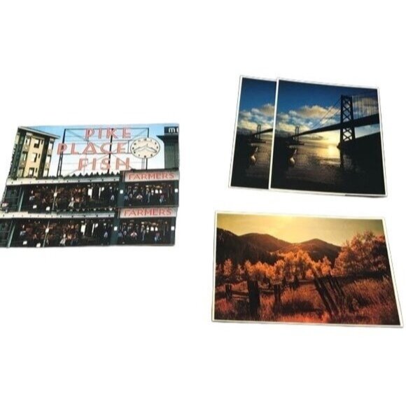 This vintage set of 5 postcards features iconic images of the San Francisco Bridge and Pike Place Market. Perfect for collectors or as unique decor, these postcards capture historic moments with exquisite detail.
