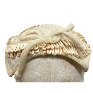 This vintage skull cap features an elegant ribbon bow, perfect for costume theater. Its ivory color adds a touch of classic shine, and it fits most head sizes comfortably.