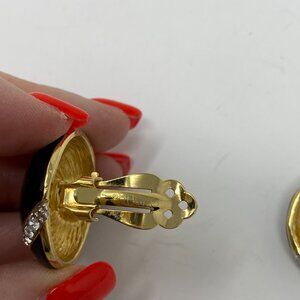 vintage st john round black enamel & rhinestone clip on earrings