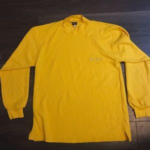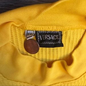 the coolest yellow vintage versace long-sleeve with an almost turtle neck like collar! has a nice striped texture and “versace” embroidered on the front