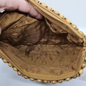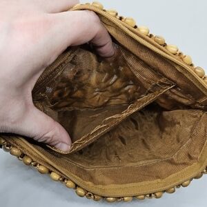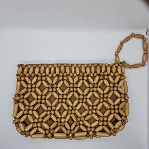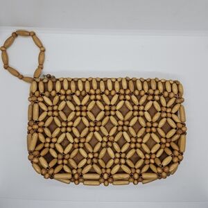 Wooden beaded clutch with brown fabric lining. Has a beaded wrist strap and the zipper pull also has beading. Interior has a few marks (see photos), but in generally good shape. Measures approximately 11" x 7"