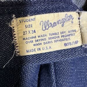The vintage Wrangler boot flare jeans in student size 27x34 are a rare find from the 70s, made in the USA. These classic blue denim jeans feature a regular fit and bootcut style, perfect for a retro-inspired look. The fabric is denim, and the character of the jeans is highlighted by the iconic Wrangler brand, showcasing a piece of American fashion history. These deadstock jeans are ideal for boys who appreciate vintage style and quality craftsmanship.