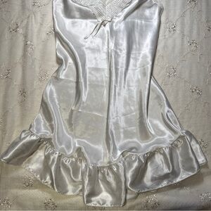 beautiful vintage Y2K satin‑feel slip dress in a soft pearlescent white featuring a delicate crochet‑style lace neckline, dainty bow detail, and thin spaghetti straps. the body has a smooth, glossy drape with a flouncy ruffled hem that gives it a sweet, romantic silhouette. no tags present, but fits best for size small/medium based on measurements and structure.
