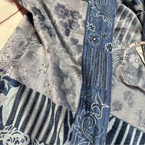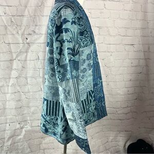 Stylish blue patterned open cardigan. Features intricate designs and a comfortable fit.