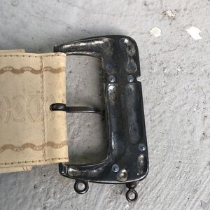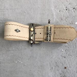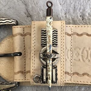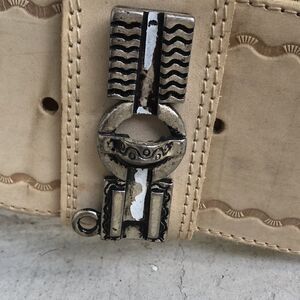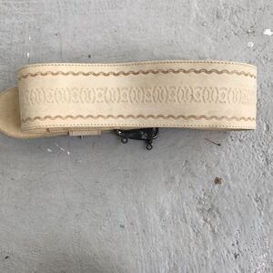 Vintage cream colored belt that needs some cleanup from having sat in a drawer for years. Check out. Send the buckle to the first hole 27.5 to the last hole is 31.5 total weight is 36, 3 inches wide. Please look at the pictures. The sword to the buckle is no longer.