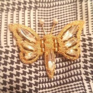 beautiful broach with dimond cut stones and gold color with 2 small perals just beautiful