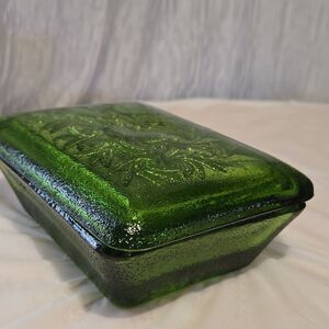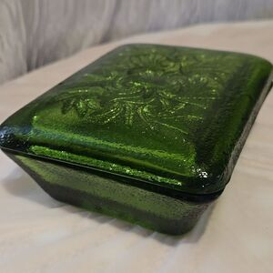 vintage green glass lidded box, likely a trinket box, featuring a textured "Sandscroll" or "Harvest leaf pattern. This style is characteristic of Mid-Century Modern design, specifically from the 1960s, and is often attributed to manufacturers like L.E. Smith Glass Co. or Indiana Glass.