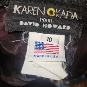 Delve into the elegance of the 1980s with this vintage Climax Karen Okada black dress. Designed for those who appreciate the sophistication of eveningwear, it features a flattering "V" sheer top and is adorned with ruffles and flares that add a touch of drama to your silhouette. Perfect for cocktail occasions, this size 10 dress is a testament to the decade's penchant for stylish flair and timeless appeal.