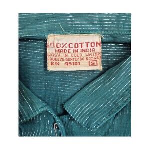 vtg 1970s Green Button Down Cotton Gauze Shirt Metallic Silver Thread Sz S in very good condition, no flaws.