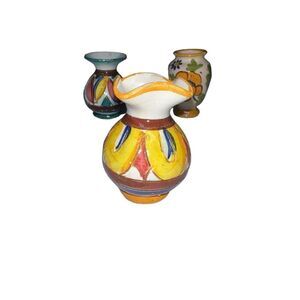 These vintage vases stand at 3 inches tall and are handmade with care, showcasing the Italian art pottery production style and technique. The backstamp is painted on, and the brand is unmarked, adding to their charm and authenticity. Perfect for collectors or as decorative pottery.