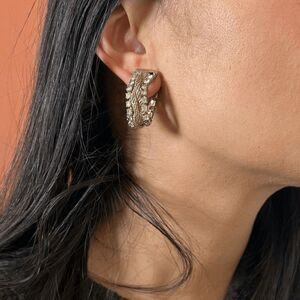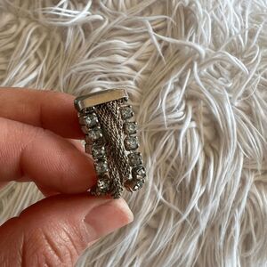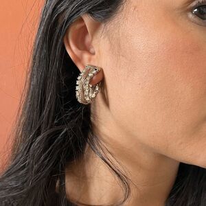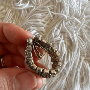 vintage 1960s art deco hoop rhinestone earrings rhinestones on either side of band center has a twisted metal rope beautiful Great vintage condition some green tinge rhinestones No stones are missing Stamped Reads Pat 1967863 (last 3 numbers may be off) approximate measurement 1 1/8" diameter