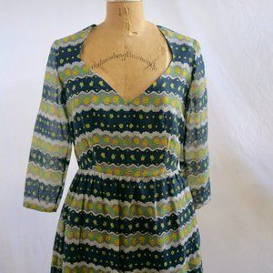 Print done in yellow, green and grey on a navy blue background. Softly pleated skirt. Zips up the back. Lined.