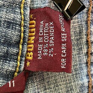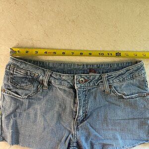 keyords: denim shorts, women's shorts, frayed hem shorts, light wash denim, casual shorts, cotton spandex shorts, summer wear, vintage style shorts, Bongo shorts, blue denim shorts, size 11 shorts, five-pocket shorts, distressed denim
