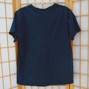 This basic tee is an 'Adult M' size that should fit a misses Medium, Large, and possibly a misses XLarge (please check measurements below). The tag shows it is one of the earlier styles and prints. (**Please note: the originally short sleeves have been trimmed shorter, leaving raw edged hems**)