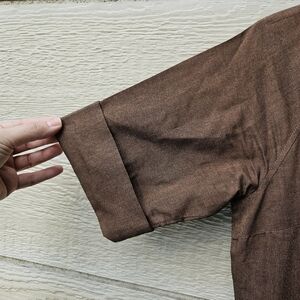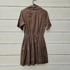 Brown collared day dress with a button-front torso and cuffed sleeves. Material feels like cotton, but internal fabric and size tag has been removed.