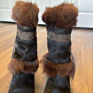 are made in Italy by TECNICA out of two types of brown fur with a rubble sole and a fake shearling lining.