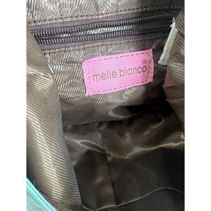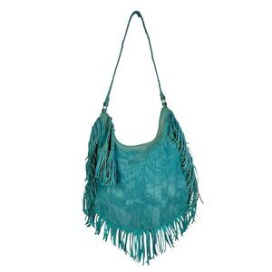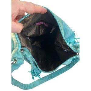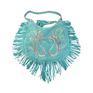 The vtg Melie Bianco Black Boho Fringe Bag is a stylish and unique accessory perfect for special occasions like weddings or parties. The turquoise faux suede fabric with silver embellishments adds a touch of retro flair to the bohemian-inspired design. The crescent shape, fringe accents, and tassel details give off a cowgirl character, while the metallic finish enhances the overall look. With shoulder strap handle, this handbag is both fashionable and functional for a trendy western or southwest-inspired outfit. in really nice condition the only flaw is some discoloration by the zip line this bag looks good