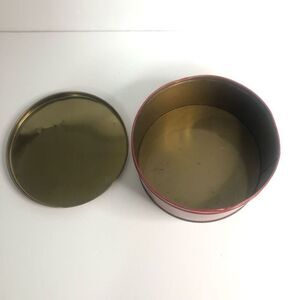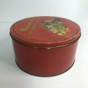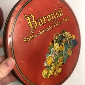 vtg baronial brand rum and brandy fruit cake metal tin round red htf as is