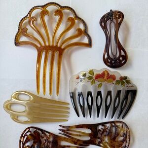 Lot of 5 hair combs 2 hand carved 1 hand painted