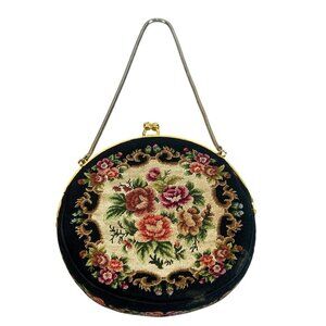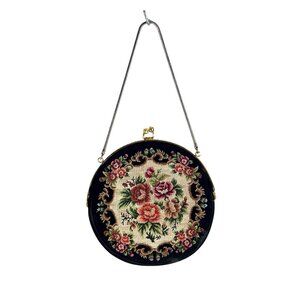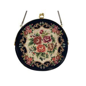 This vintage made in France micro needle point wristlet bag features a round shape with a kiss lock closure and gold hardware accents. The floral pattern and victorian character add a touch of elegance, making it perfect for formal occasions like weddings or parties. The multicolor black exterior with petit point embroidery and gold trim details reflect the art deco and classic themes of the bag. Handmade with a satin lining in black, this small bag is a unique and stylish accessory for women looking to add a touch of vintage charm to their outfit. in really nice clean condition some fade on the chain, beautiful collectable great for a shabby chic decor as well