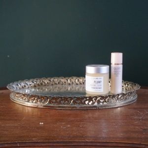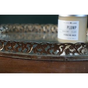 very chic laced brass vanity tray that will add just that touch of glamour to your makeup and give them an organized space. you could also attach wall mounts and hang this as a vintage gold crested wall mirror. Very Coquette girl.