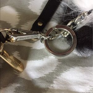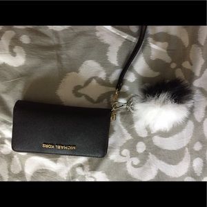 Michael Kors wristlet. The zipper has a few scratches but it's in great condition. The fluff ball is also Micheal Kors.