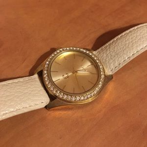 stainless steal watch in great condition!!! Off white leather band, gold face with halo bling going around. Nine holes, which is great for many sizes. Still ticks.