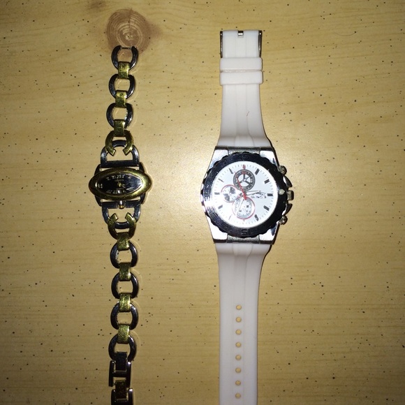 Neither of the watches are currently running🔹gold and silver one does not latch close🔹 I don't believe either are brand name rather show jewelry