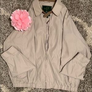 Tan windbreaker. Waterproof garment company. Zipper front. Thin lining. elastic around waist. Great shape. Super for windy or rainy days. Light weight.