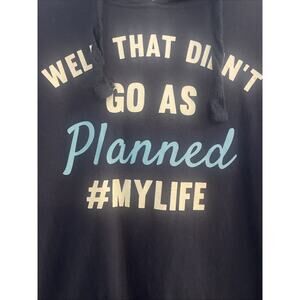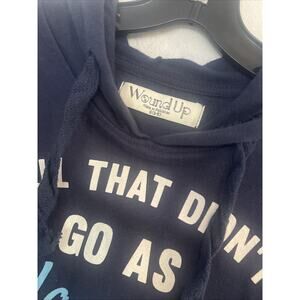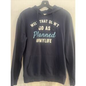 The "well that didn't go as planned #mylife" sweatshirt is a solid blue pullover with long sleeves and a crew neckline. Made from a comfortable cotton/poly blend fabric, this juniors size S sweatshirt features a graphic print, hood, and front pocket. Ideal for activewear, this regular fit sweatshirt is perfect for wearing in the winter, fall, or spring seasons. Whether for school or casual occasions, this sweatshirt by Wound Up adds a touch of life-themed style to your wardrobe.