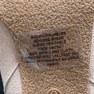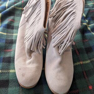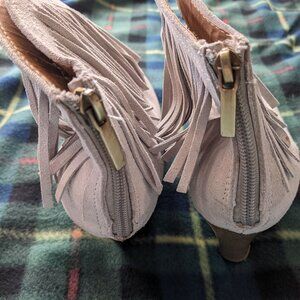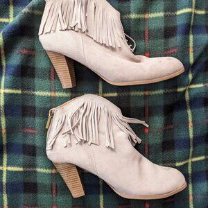 Beige genuine suede heeled ankle boots with tassels. Women's size US 9. Heels are 3" tall. No brand information on the shoes.