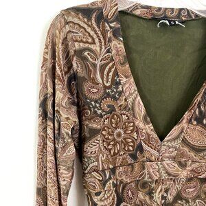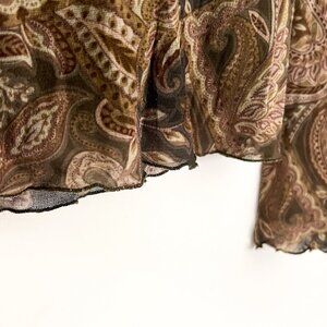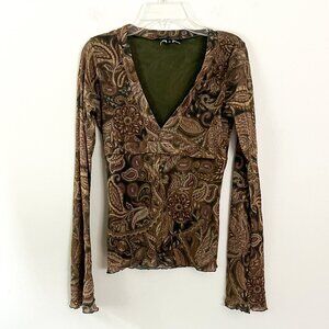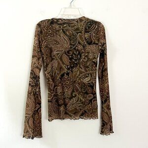 Retro and effortless, this vintage Weston Wear mesh top features a brown and olive green paisley print with a flattering V-neckline and long sleeves. Lightweight and semi-sheer, it’s perfect for layering or styling with your favorite Y2K denim.