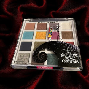 This new, limited-edition wet n wild palette features 12 eyeshadows and 4 face powders inspired by Tim Burton's The Nightmare Before Christmas. The palette is square, approximately 4x4 inches, and housed in a clear plastic case with a cardboard backing featuring Jack Skellington and Sally. The colors range from shimmery golds and greens to matte browns and blues. All shades appear to be in perfect condition. The packaging shows no damage.