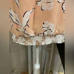Fully lined, tie neck, elastic waist.