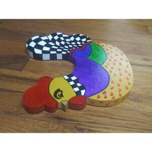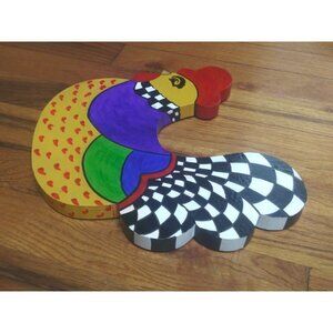 Very pretty, one of a kind OOAK, colorful, vibrant, whimsical hand-painted Rooster Figurine wall-hanging Multicolor & black white checkered wood