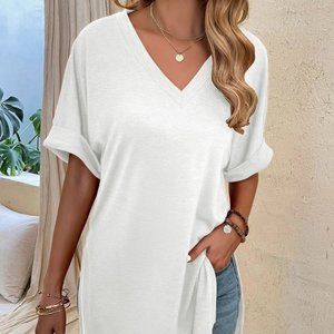 White Preppy Womens Batwing Sleeve Split Hem Tee