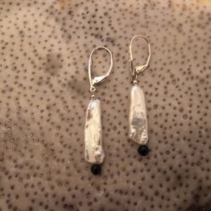 designed and created uniquely for you. Fresh water pearls with onyx beads and sterling clasp. 18.5 inches. Dangly earrings of pearl and onyx.