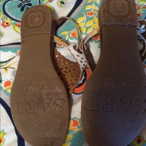 white sandal with flower print and silver strap and tan bottom. worn them once. haven't work them again