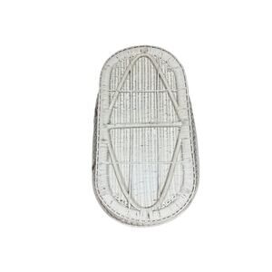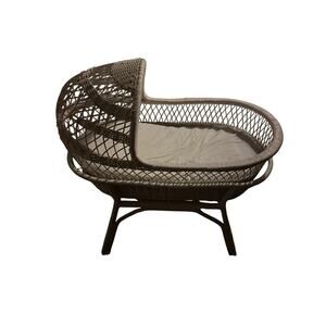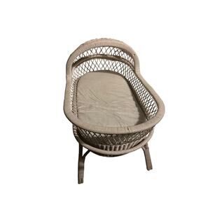 wicker bassinet, likely a Pottery Barn Kids complete with a mattress pad.