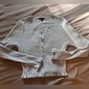Ribbed knit button-front cardigan in cream. Features subtle ruffle hem and long sleeves. Lightweight layer with a feminine silhouette. Easy to pair with jeans or skirts.