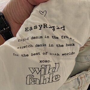 High rise jeans, very nice quality recycled cotton blend. Distressed on pockets front and back. Very light wash, almost white but you can see hints of blue. Size 6. Ankle length.